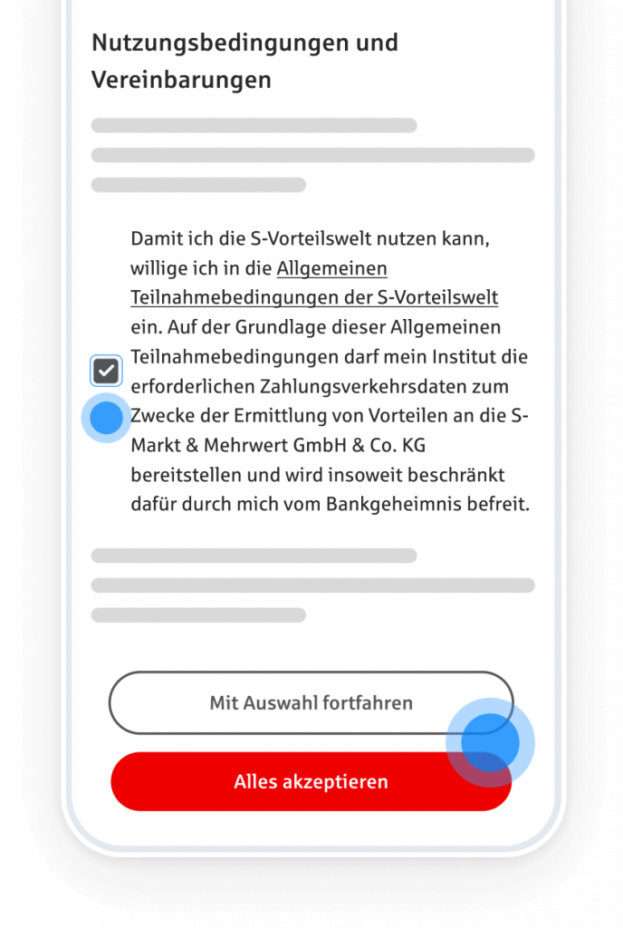 Um PAYBACK mit deiner Sparkassen-Card (Debitkarte) zu nutzen, stimme den Teilnahmebedingungen der S-Vorteilswelt zu. Wähle dafür die gewünschte Einwilligung aus und tippe auf „Mit Auswahl fortfahren“ oder „Alles akzeptieren“.